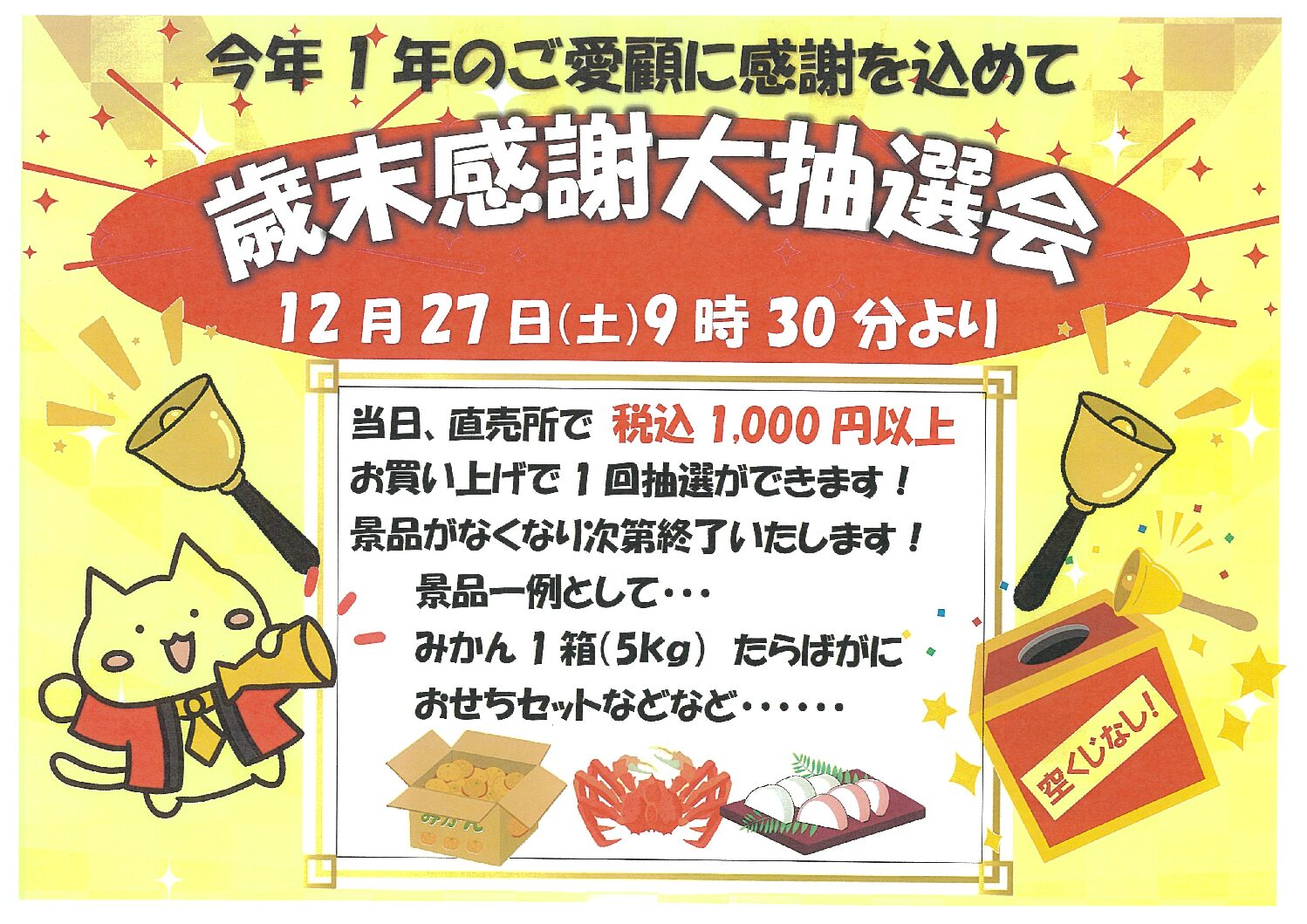 12月27日(土) 農産物直売所では日頃の感謝を込めて 「歳末お客様感謝抽選会」を開催致します。 直売所内で税込1,000円以上お買上げレシートで1回抽選できます。 ※2,000円以上のお買上げでも1回の抽選になります。 …