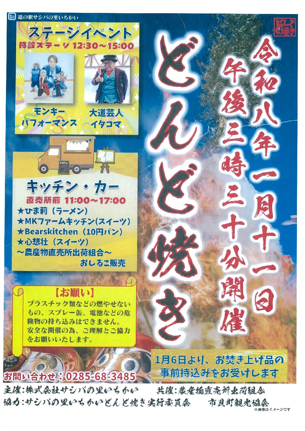 1月11日(日)サシバの里「どんど焼き」開催 午後3時30分より点火 道の駅西側駐車場にて行います。 お焚き上げは、まちおこしセンターにて受付ております。 当日は、キッチンカー等が出店致します。 詳細は ⇒ どんど焼き