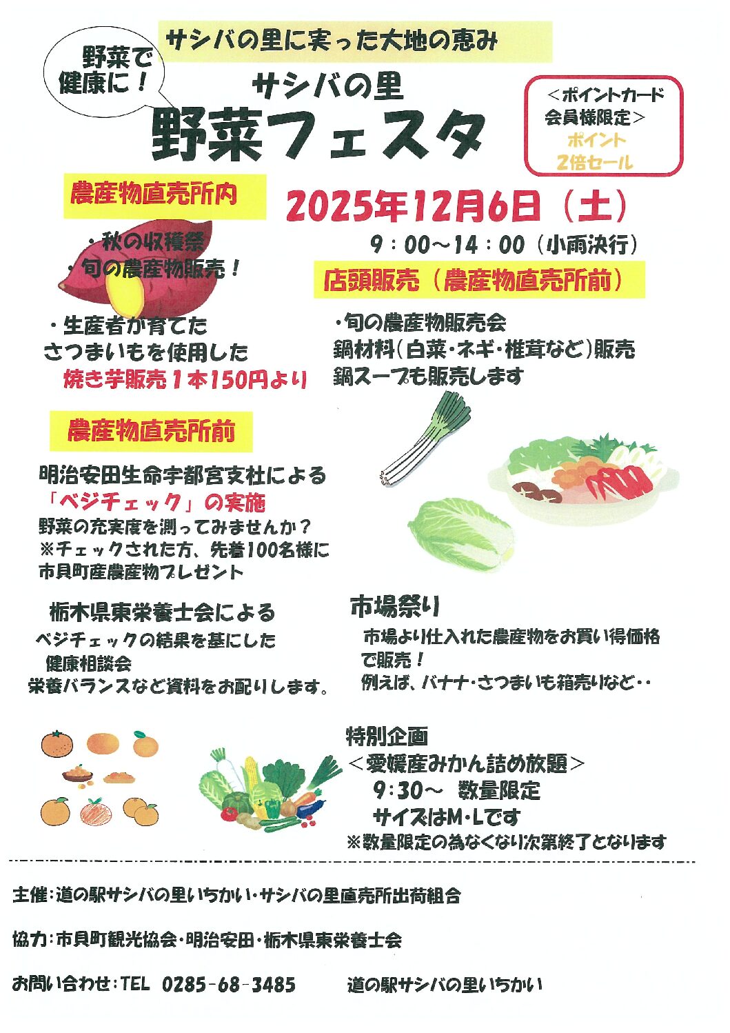 12月6日(土)サシバの里「野菜フェスタ」を開催 明治安田による「べジチェック」・栃木県東栄養士会による「健康相談会」 農産物直売所前では、鍋材料販売会・市場まつりとしてバナナ・さつまいも箱売りなど 午前9時30分~ 愛 …