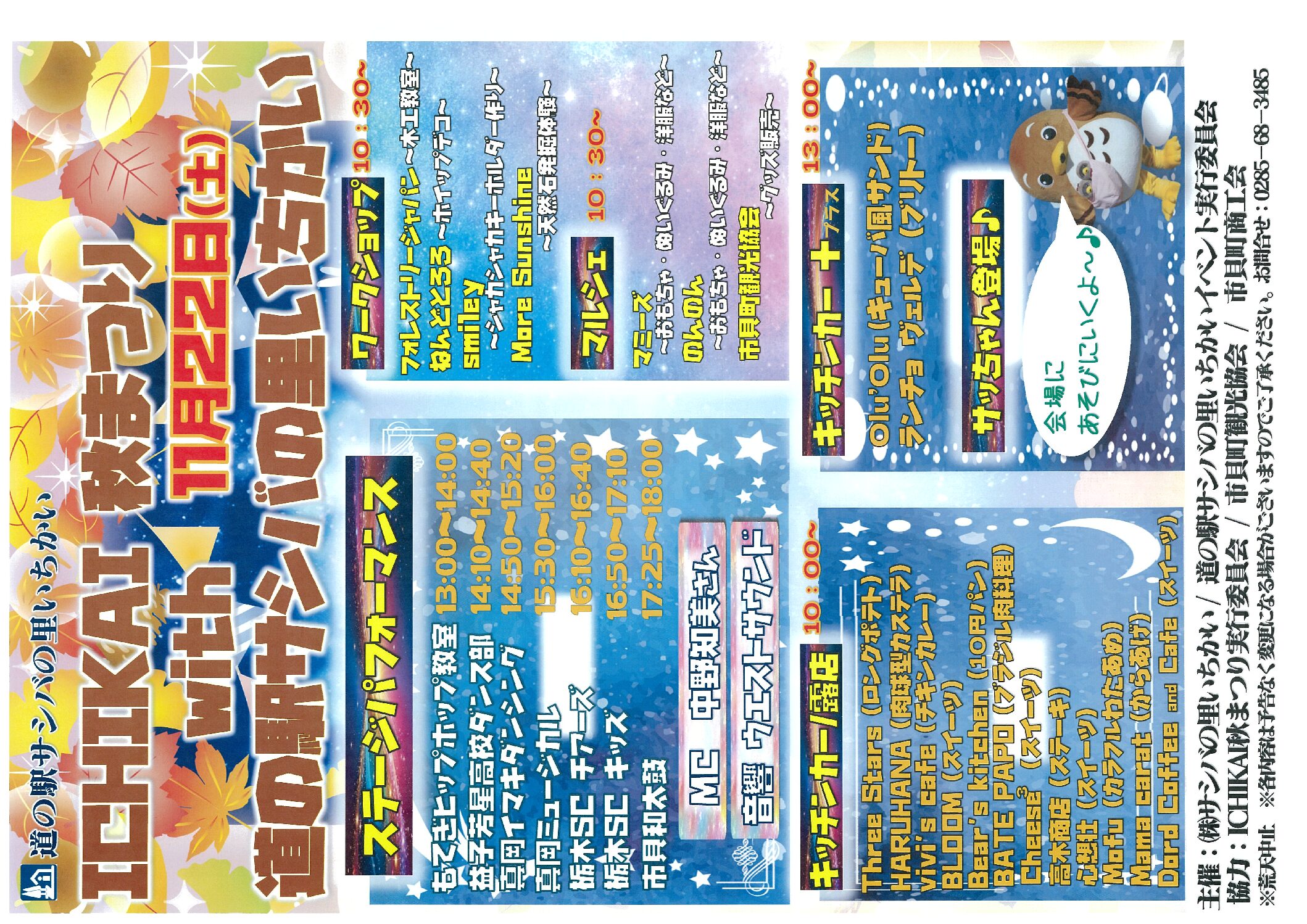 11月22日(土) いちかい秋まつりが行われます 役場広場にて町民祭・JA市貝支店にてJAまつり 夕方6時より、道の駅南側にて打上花火 道の駅でも、いちかい秋まつり with 道の駅として ステージイベント・キッチンカー …