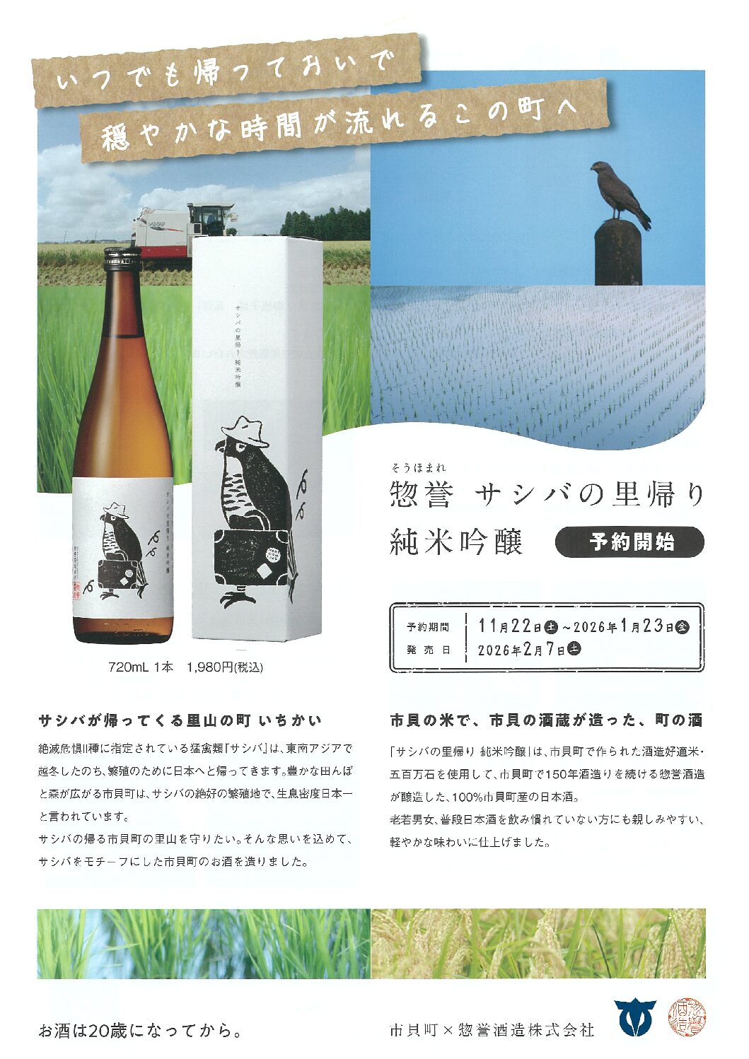 惣誉×市貝町 サシバの里帰り 純米吟醸720ml 予約受付中です! サシバの里帰り 予約期間:11月22日(土)~2026年1月23日(金) 発売日(お渡し開始):2026年2月7日(土) 価格:1本 1,980円( …